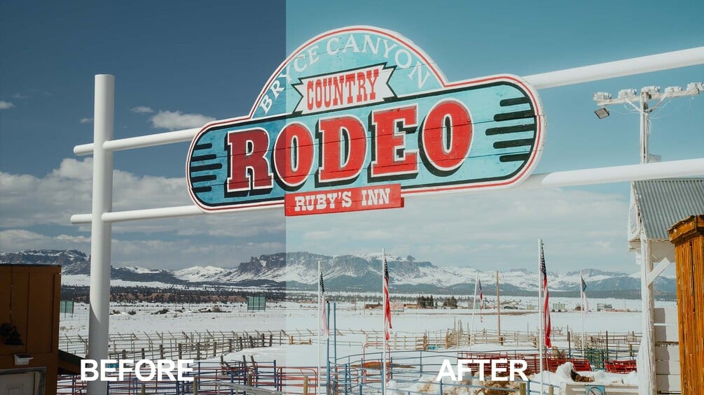 The F400K preset is inspired by typical colors and tonality you would find when using a Kodak film stock. Overall warmth, light green tones, and dreamy blue skies.